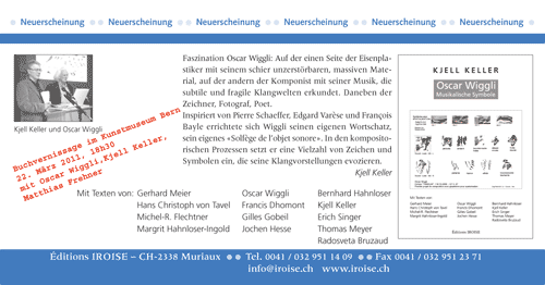 | Présentation le 22 mars 2011 au Musée des Beaux-Arts de Berne du livre de Kjell Keller : Oscar Wiggli – Musikalische Symbole Allocution de Matthias Frehner et entretien de Kjell Keller avec Oscar Wiggli (édition en allemand) |